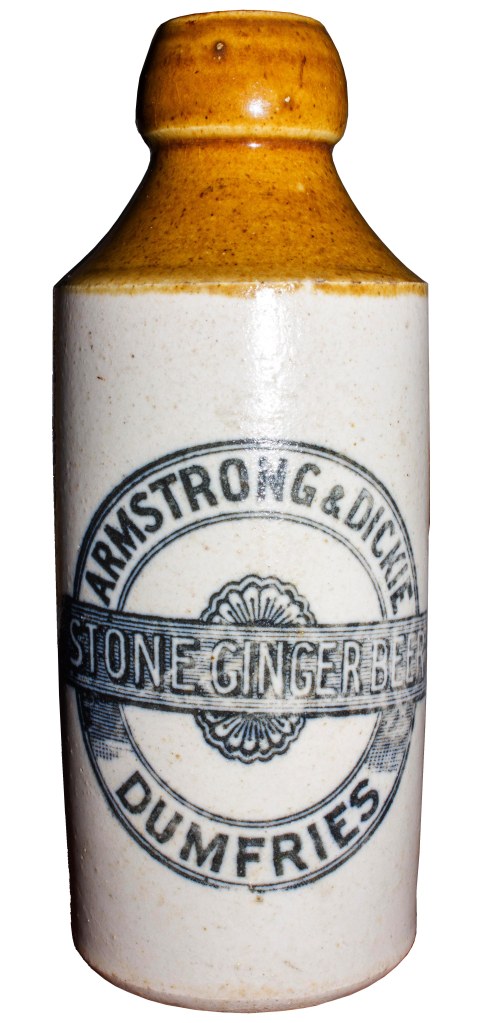 In Dumfries there’s a grand looking building on the Whitesands, next to a pool hall. It’s fallen into disuse now but this building was the aerated waterworks of Armstrong & Dickie. The works was built around an artesian well in the Dockhead area of Dumfries. It was designed by Dumfries architect Wilfred Fitzalan Crombie, they were so proud of the building they used its likeness on their bottles for a while too. The water works eventually passed to the Workington Brewery Co Ltd…