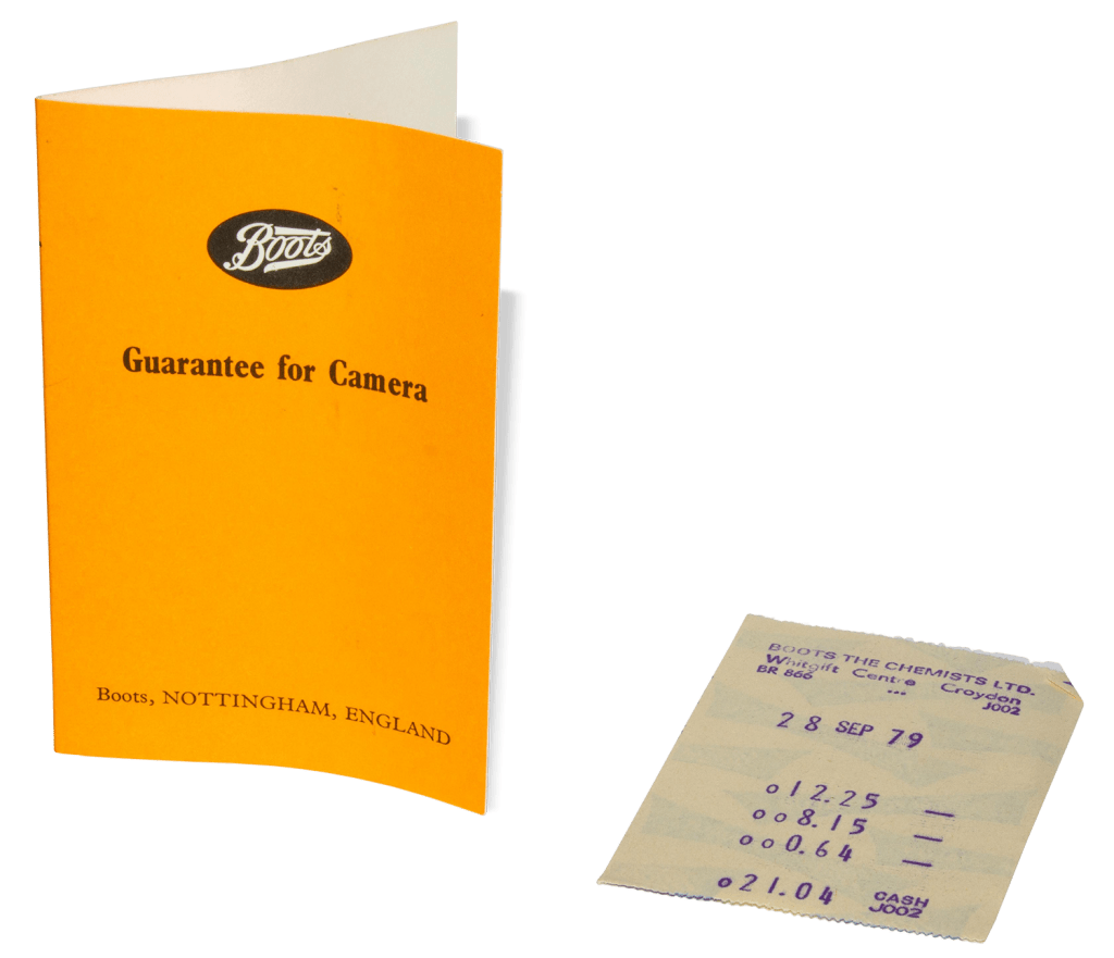 This one came to me with its packaging, with grantee and receipt and a case. The receipt details the purchase at the time, the camera costing £12.25, I am unsure if the £8.15 purchase was for the case as I believe they were sold with a case though there’s certainly no room in the box for it, but the 64p was most likely for the film.