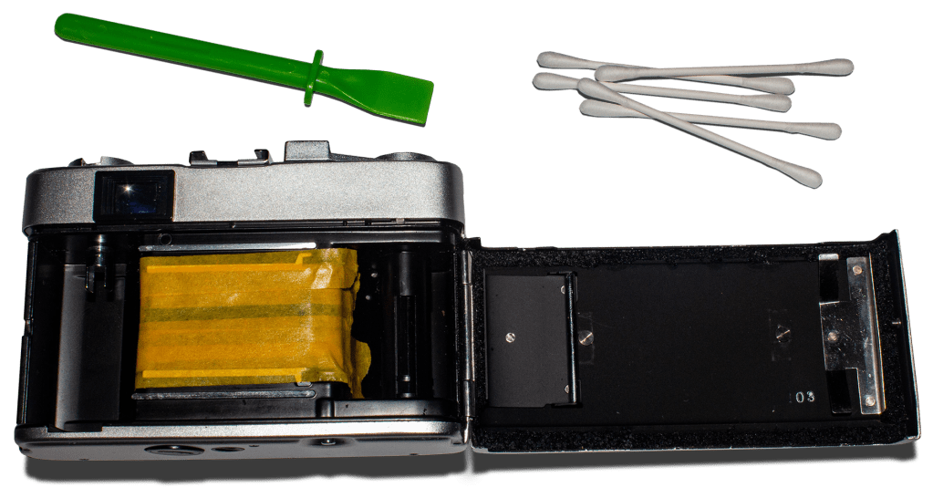 First step was to cover the film mask and shutter area, note and double check where the seals are, measuring widths if necessary, then to use isopropyl alcohol, a glue spreader (for scraping gently) and cotton buds all for cleaning the perished seals from the camera. I was helped this time by the seals for this particular camera being on the door… Then using some new foam replicating what was there before.