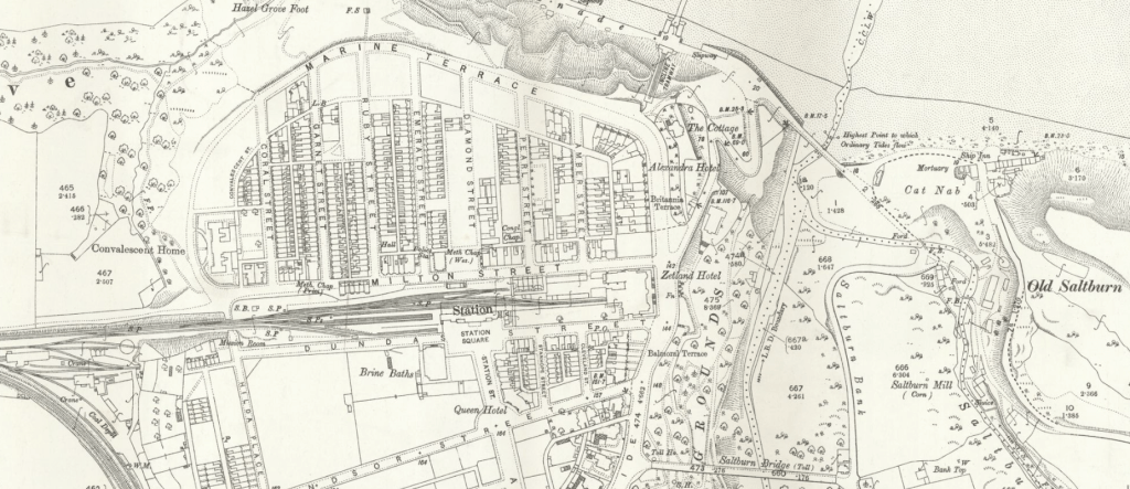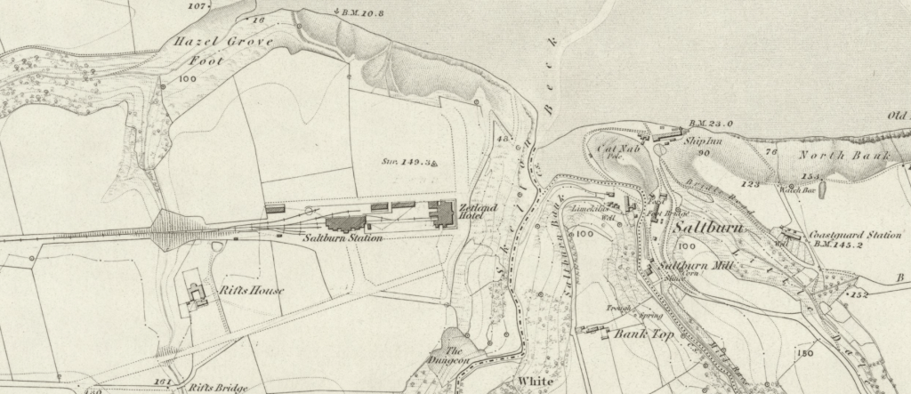 On the OS Map published in 1856 we see that the station, hotel and railway lines are added, along with a wireframe of I assume as part of some sort of “plan” for Saltburn, as none of these things would have existed when this map was surveyed in 1853.