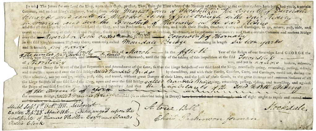 The indictment states that Mandale Bridge was somewhat neglected by those in the township of Thornaby, and had fallen into a ruinous state. Submitted in October 1811 it was then discharged upon the certificate of Thomas Hustler and who I assume to be the Right Worshipful Charles Baillie, Clerk and Archdeacon of Cleveland, in 1816.