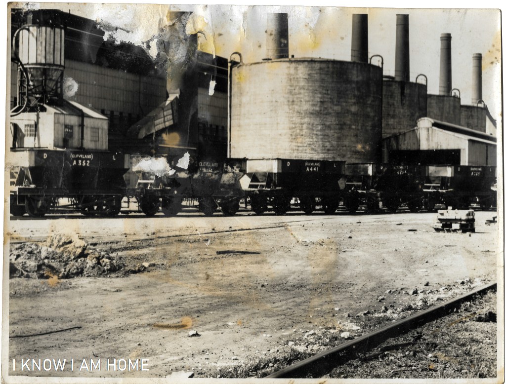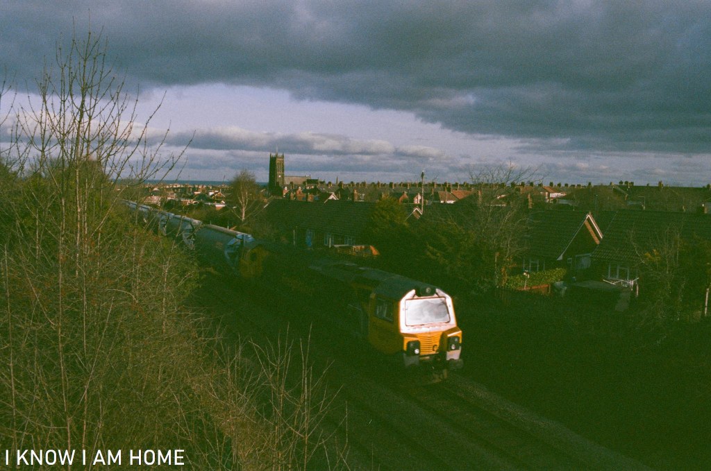 A bright but cold day, an approaching rumble. The sea in the background, Emmanuel Church prominent, but the spire of Saltburn Methodist Church also to be seen. The freight train passes…